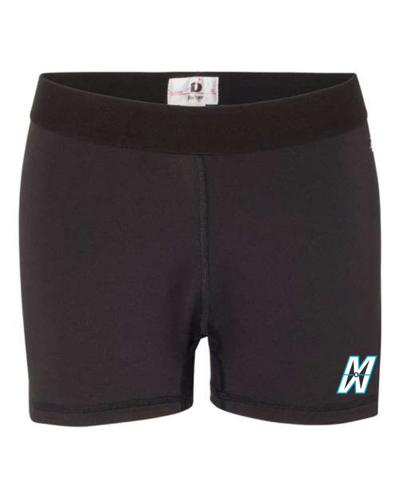 90/10 polyester/spandex moisture management fabric; Stretch body fit; 1 1/2" black elastic waistband; 3" inseam; Badger heat seal logo on left hip